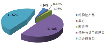 组合投资类产品发行款数小幅增加1.92%至4562款,但受债券与货币市场类增幅较大的影响,组合投资类产品市场占比下降0.82个百分点至45.62%。组合投资类产品的投资标的主要为债券、货币市场工具、票据资产、信贷资产、信托贷款以及各种融资性质的信托受益权等等,产品普遍采用“资产池”运作模式,通过期限错配为投资者创造较高收益。