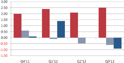 央行仍然是黄金的坚实购买方,2012年前三季度各国央行黄金储备同比增持9%,共计买入374吨。发展中国家央行购金增速最快,金价低迷时,各发展中国家央行纷纷增持黄金,以实现外汇储备多元化。其中,韩国央行在7月份购入黄金16吨至70.4吨,黄金储备占其外汇储备的1.3%;巴西央行在10月增持黄金5%至35.3吨,是2008年以来的首次报告增持。另外,俄国、墨西哥、委内瑞拉等国央行少量卖出黄金,共售金6.2吨。