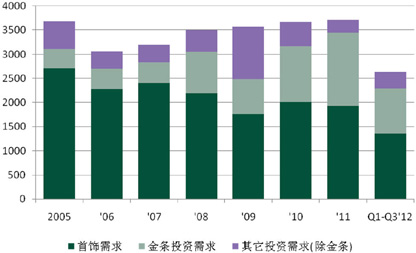 2012年前三季度需求总额3325吨,比2011年同比下降1%(表1)。供给方面,矿产金供给与去年同期持平,生产商套保由正转负,旧金回收量仅比2011年同期减少4吨。通常金价上涨时旧金回收量同步上升,2012年前三季度金价上涨超过10%,旧金回收量未同步增加预示第四季度市场对金价上涨预期不强。