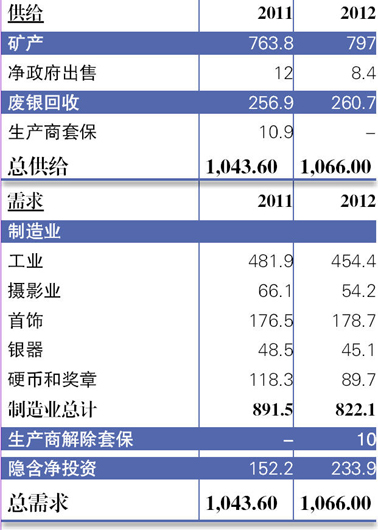 白银供给略有增加。2012年的矿产量维持了已经持续十年的增长势头。不仅如此,废银供给还创出历史新高,主要原因是印度的首饰和银器回收增加。因此,白银供给与制造业需求之间的缺口有所扩大。这个缺口由白银投资者来弥补,凸显出白银价格更易受到投资者情绪的影响。(表1