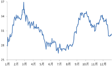 2012年白银价格呈M型振荡走势,开于27.84美元/盎司,收于30.35美元/盎司,全年上涨9.02%,最高37.19美元/盎司,最低26.12美元/盎司。前三季度贵金属走势为美联储货币政策预期所主导。1月美联储决定维持超低利率至2014年底,远长于预期,白银价格上涨并创下全年高点。2月底伯南克在国会证词中对QE3只字未提,白银转为下跌趋势,6月底见全年低点。第三季度在欧洲央行OMT和美联储QE3的推动之下白银重拾升势。第四季度受美国财政悬崖问题影响,白银冲高回落。临近年末时受对冲基金调仓影响大幅下挫。(图1