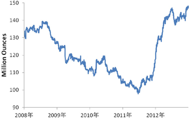 库存状况是反映供需形势的晴雨表。由于供需缺口扩大, Comex白银库存一改之前的下降趋势,从2011年下半年开始大幅上升。20127月初,Comex库存达到一个阶段性高点147 Moz,为五年以来的最高位。之后数月库存略有下降,但到年末又开始攀升并且突破年终高点。1231Comex库存为148 Moz。如果2013年库存延续上扬趋势的话,势必对银价构成压力。(图2