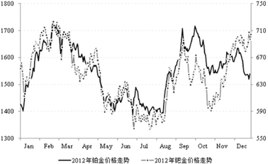 2012年间,国际市场现货铂金价格开于1403.50美元/盎司,历经两番起落,收于1540.00美元/盎司,累计涨幅9.72%,最高1735.99美元/盎司,最低1379.05美元/盎司。钯金价格开于653.49美元/盎司,收于704.10美元/盎司,累计涨幅7.74%,最高725.19美元/盎司,最低553.75美元/盎司。钯金价格走势大体跟随铂金,历经两番起落之后,在年末一路走高。(图3