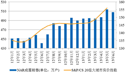 美国经济上半年呈现温和复苏态势,复苏脚步逐步加快,个人消费及房地产成为增长动力。美国一季度GDP同比增速虽从2.5%下修至1.8%,但较2012年四季度的0.4%有明显改善。第二季度,美国经济复苏加速。5月美国密歇根大学消费者信心指数达到20077月以来最高水平84.56月虽小幅回落,但仍处高位,显示增税未影响消费者信心。房地产市场呈现价量齐增局面:5S&P/CS 20座大城市房价指数同比增长12.2%,创七年最大同比增幅;美国6NAR成屋销售环比虽小幅下滑1.2%508万户,仍位于0911月以来的高位。劳动力市场也呈现复苏迹象,6月非农就业人数为19.5万,失业率降至7.6%。制造业表现疲弱,ISM制造业PMI2月以来反复回落至5月低点49.06月虽回升至50.9,仍处于较低水平,显示制造业复苏动能不足。(图2