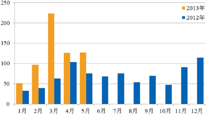 中印两国是全球重要的黄金进口国,一季度两国黄金需求因金价下跌而大增。根据世界黄金协会公布数据,一季度中国的黄金需求为294公吨,比去年同期高出20%,印度的黄金需求为257公吨,比去年同期高出27%。从香港特区政府统计处数据来看,2012年全年中国从香港进口黄金达到832.16公吨,同比上升94%。而今年前5个月,中国从香港进口黄金就达到625.01公吨。(图3