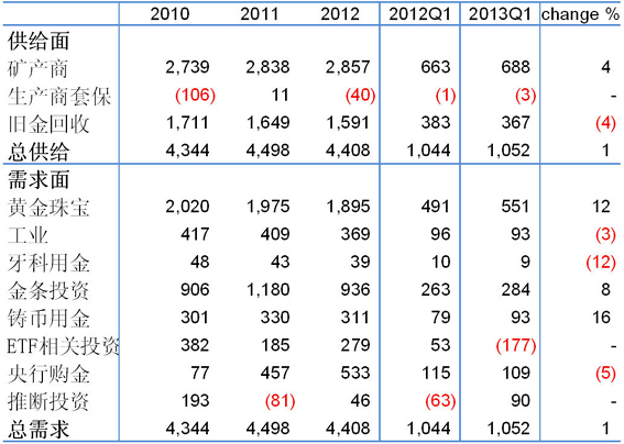 2013年一季度黄金供给稳定,较去年同期小幅增加近1%。矿产金同比增加约4%,旧金回收下降4%