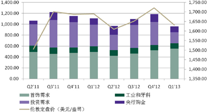 2013年一季度黄金珠宝需求为551吨,较去年同期上涨了12%,主要是亚洲需求强劲。其中中国2013年第一季度黄金珠宝需求同比上升19%,至历史高位185吨;印度和中东地区此数值均同比上升15%;美国的黄金珠宝需求也同比上涨了6%,为2005年以来首见。