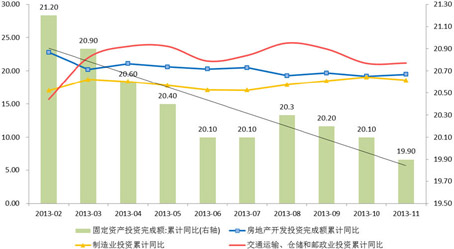 2013年固定资产投资同比增速基本符合市场预期,1-11月份累计同比增速为19.9%,最高点21.2%出现在2月份。从固定资产投资的三大构成来看,基建和地产是过去几年稳增长政策的传统抓手,几乎是每一轮经济复苏的引擎,二季度和三季度经济增长的加速也建立在基建和房地产投资走强的基础上。