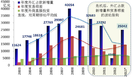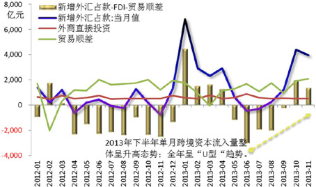 金融危机前,外汇占款新增量同贸易顺差的波动基本一致,但2010年之后却出现分歧,原因在于,金融危机后跨境资本流动的波动性增大。跨境资本波动的背后,是国际国内投资机构在外币和人民币资产间的配置偏好调整,故而,综合考虑:(1)美联储QE退出已启动,大概率将在2014年逐步削减购债规模,而美联储持债规模同跨境资本流量存在一定正向联动关系;(2)国内经济景气度预计将基本稳定,对国际资本的吸引力有限;以及(3)从政策面看,外管局防范虚假贸易融资行为仍在持续,将遏制异常外汇资金跨境流动,预计2014年全年新增外汇占款水平将低于2013年,但波动率可能增加。(图8)