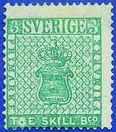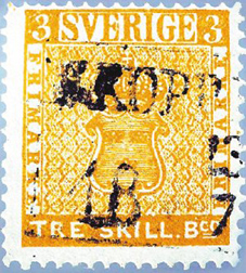 瑞典于1855年开始发行邮票,虽然比最早发行邮票的英国迟了15年,但也是世界上最早发行邮票的30 个国家和地区之一。在北欧,它发行邮票的时间迟于丹麦的1851年、荷兰的1852年和挪威的1854年,但却早于芬兰的1856年和沙皇俄国的1857年。而“黄3基林”邮票就是瑞典发行的第一套邮票中的一枚“错体票”,这套瑞典发行的第一套普通邮票共计5 枚,其刷色和面值分别是:3基林为墨蓝色、4基林为浅蓝色、6基林为灰黑色、8基林为桔黄色、24基林则是暗红色。但是应该是墨蓝色的3基林面值邮票,却在1885年被发现有桔黄色的邮票,而这种颜色与面值为8 基林的邮票颜色相同。在发现这枚错色邮票邮票后的130年间,全世界均没有再出现过第二枚,也没有任何第二枚“黄3 基林”邮票的报道,可谓独一无二的绝品。尽管这枚充满传奇色彩的“黄3 基林”邮票被集邮界所承认并推崇,不过令人惊讶的是1974年发行此票的瑞典仍然否认它的存在,特别是瑞典邮政博物馆竟宣布此票是犯罪分子的伪造品。但恰恰是瑞典邮政博物馆的否认,却令“黄3 基林”邮票的名声大振,当时的拥有者—比利时富翁雷内·贝利吉通过各种权威机构高科技检测手段以及各种馆藏史料来证明其确实存在的合理性,而这场发生于1975年轰动世界邮坛的“黄3基林”邮票真伪之争,也使得“世界第二珍邮”的知名度陡涨。
