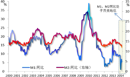 金融:货币和社会融资余额增速均持续放缓。货币增速的回落,一方面与新增外汇占款规模的明显回落有关,另一方面则与银行存款增速的趋势性下降有关。而存款增长乏力的原因主要有二,一是日趋严格的影子银行监管和中性偏紧的货币政策,导致了非标派生存款规模的减少;二是“余额宝”等利率市场化催生的货币市场基金产品,对于银行存款构成了一定分流。