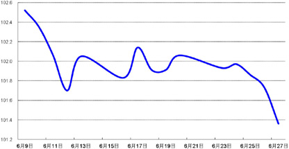 货币市场:上周,由于临近半年末时点,市场流动性略有趋紧,银行间市场质押式回购7天期品种加权利率上行36个基点至3.86%。但从央行公开市场暂停正回购操作的动作中,可以看出央行稳定资金波动的意图明显,因此,机构对流动性前景仍较为乐观。