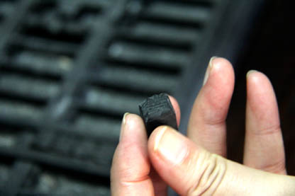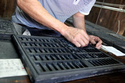 王士生就是在展示馆的演示室里面演示的印刷术。走进演示室,顿时墨香扑鼻。屋子并不大,是展柜的布局。几张拼合在一起的长方形大木桌子,以反“L”形隔开了里外。面向大门的横向大木桌上,放着几碗水、墨汁、墨刷、墨板和棕刷;旁侧的大木桌上,则罩着玻璃柜,柜内,是一盘盘已经排好版的字盘,字盘上面密密麻麻地刻着一个个字模,字模黑如墨碳,大约是在墨汁里浸润的时间长久所致,组成可任意编排的木活字印刷术的印刷母版;里面靠墙也是几张拼合的长方形大木桌,上面,同样放着一盘盘黑乎乎的排版用的印刷母版。