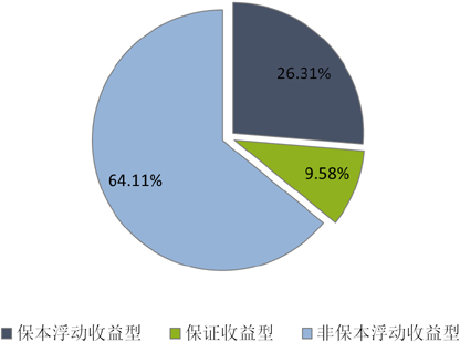 从收益类型来看,保证收益型产品发行了804款,环比减少195款,市场占比下降0.44个百分点至9.58%;保本浮动收益型产品发行了2208款,环比减少307款,市场占比上升1.07个百分点至26.31%;非保本浮动收益型产品发行了5380款,环比减少1072款,市场占比下降0.63个百分点至64.11%。(图1)