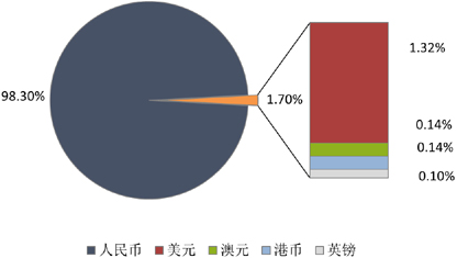 从投资币种来看,人民币产品发行了8249款,环比减少1503款,市场占比上升0.44个百分点至98.30%;美元产品发行了111款,环比减少49款,市场占比下降0.28个百分点至1.32%;澳元产品发行了12款,环比减少11款,市场占比下降0.09个百分点至0.14%;港币产品发行了12款,环比减少2款,市场占比保持不变,仍为0.14%;英镑产品发行了8款,环比减少9款,市场占比下降0.08个百分点至0.10%。(图2)