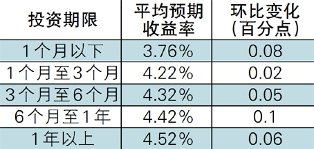 虽然季末考核因素已经结束,但是本月市场资金流动性持续偏紧,也使得银行理财市场收益水平继续维持攀升趋势。本月人民币银行理财产品的平均预期收益率为4.30%,环比上升0.05个百分点。各期限类型产品收益水平均出现上涨,其中6-12个月期限段产品涨幅最大,1年以上期限类型产品再次站上4.50%。(表1)