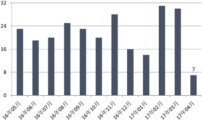 本月共有45家信托公司发行了157款集合信托产品,发行数量环比减少12款,降幅为7.10%。可以看到,最近债券等标准融资受到一定阻碍,虽然整体融资需求依然不振,但考虑到债券融资与信托融资的成本差在缩小,集合信托产品的发行趋势可能在二季度末发生反转。(图5)