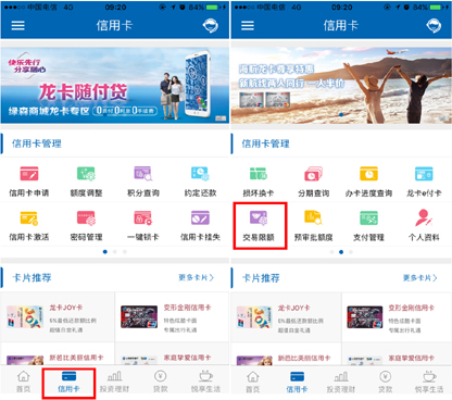 95533答:登录我行手机银行,进入“信用卡-信用卡管理-交易限额”菜单,选择本人名下附属卡,按页面提示即可设置账单周期内的交易限额,该交易限额将在账单日后自动恢复并重新开始累计。如因设置限额而导致该卡可用额度不足,您可选择关闭或提高“本期交易限额”。(客户服务中心)