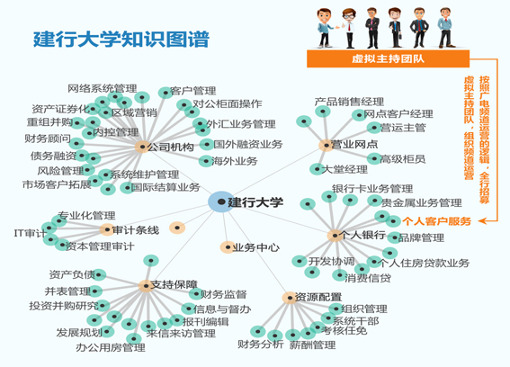 通过网络平台建设金融业务知识库,打造建设银行知识图谱,将个体知识企业化,隐性知识显性化,封闭知识共享化。将个体知识转变为企业的知识资本,将建行大学建成实用金融企业知识积淀的宝库,智慧共创共享的摇篮。(图4)