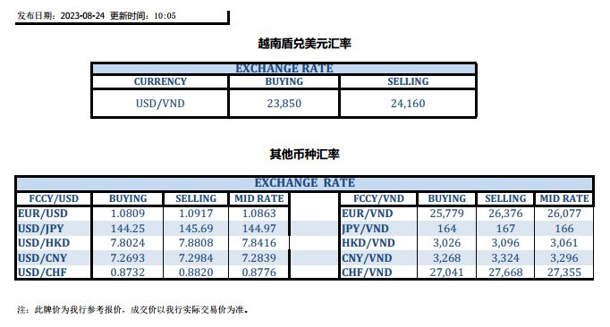 今日汇率 2023-08-24