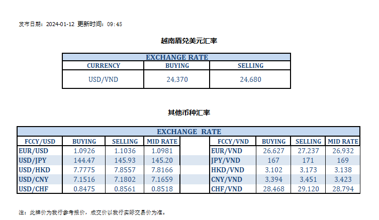 今日汇率 2024-01-12