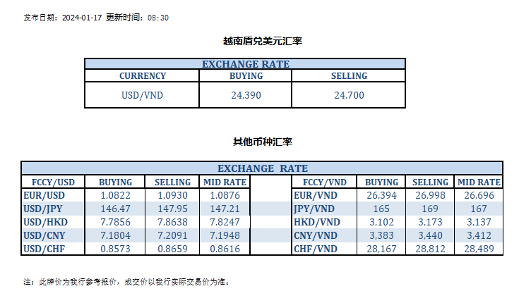 今日汇率 2024-01-17