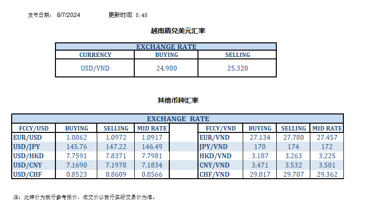 今日汇率 2024-08-07