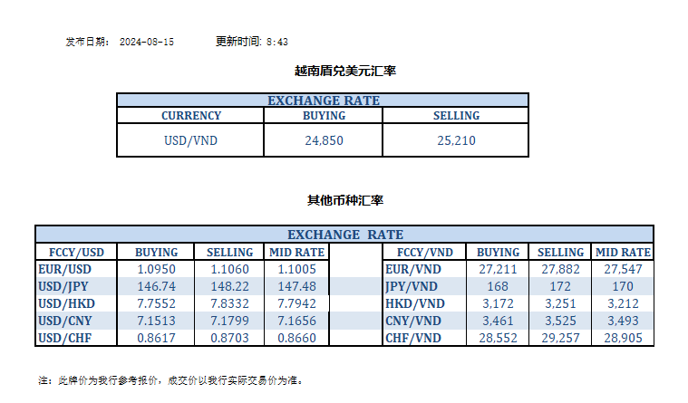 今日汇率 2024-08-15