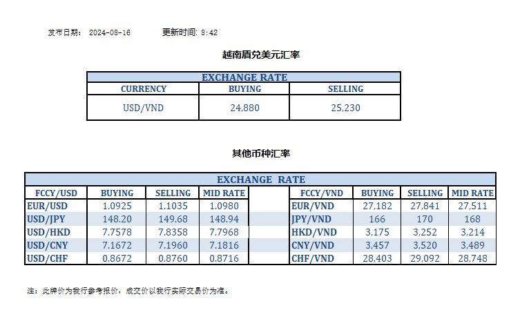 今日汇率 2024-08-16
