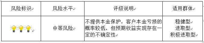 本期产品为非保本浮动收益型理财产品,不保证本金和收益,请您充分认识投资风险,谨慎投资。本期产品期限149天(中国建设银行有权对本期产品进行展期和提前终止),存续期内产品不接受申购或赎回申请。本期产品内部风险评级级别为3盏警示灯 ,风险程度属于较低风险。最不利情况下,资产组合无法回收任何本金和净收益,客户将损失全部本金。产品适合于收益型、稳健型、进取型、积极进取型客户。