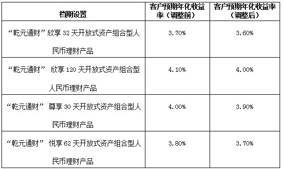 关于调整“乾元通财” 欣享120天开放式资产组合型人民币理财产品等4期产品客户预期年化收益率的公告