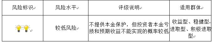 本期产品为非保本浮动收益型理财产品,不保证本金和收益,请您充分认识投资风险,谨慎投资。本期产品期限112天(中国建设银行有权对本期产品进行展期和提前终止),存续期内产品不接受申购或赎回申请。本期产品内部风险评级级别为2盏警示灯 ,风险程度属于较低风险。最不利情况下,资产组合无法回收任何本金和净收益,客户将损失全部本金。产品适合于收益型、稳健型、进取型、积极进取型客户。