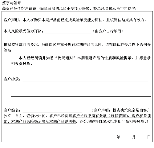 客户声明:投资决策完全是由本单位独立、自主、谨慎做出的。本单位已经阅读客户协议书所有条款(包括背面)、客户权益须知、本产品风险揭示书及本产品说明书,充分理解并自愿承担本产品相关风险。 机构客户盖章(公章或合同专用章)
