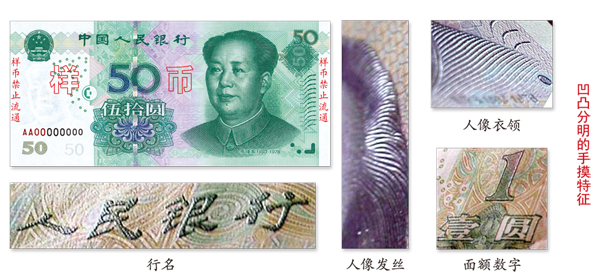 人民币正背票面中的国徽、行名、中文面额数字、光变油墨面额数字、盲文标记等均为雕刻凹印图案。上述图文具有独特的浮雕式的凹凸效果,可以通过手指检查其触感特征。
