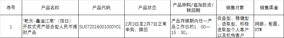 为切实保障客户权益,保证理财业务平稳运营,2020年2月3日至2020年2月7日,中国建设银行股份有限公司苏州分行发行的“乾元-鑫溢江南”资产组合型人民币理财产品开放式产品正常开放申购、赎回;期次型产品正常成立、到期、兑付。目前“乾元-鑫溢江南”理财产品在售清单如下: